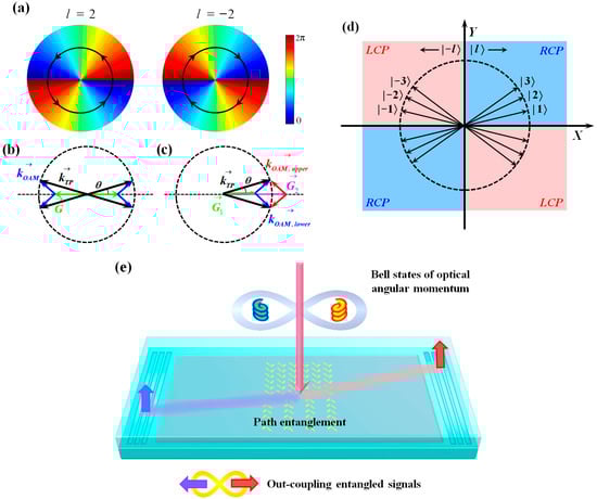The asymmetric grating couples OAM states with different topological charges into their respective propagation directions on the chip [30,31]; thus, the OAM entanglement can be converted into path entanglement. To introduce the working principle, we should first clarify the azimuthal k-vector carried by the OAM mode [31], as is sketched in Figure 2a. The corresponding spatial distribution exhibits circular symmetry. When the OAM state is launched onto a grating, guiding polaritons can be excited through light–matter interaction when the k-vector matching condition is satisfied: