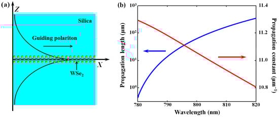 The practical performance of the proposed metadetector depends on the geometry parameters, which need to be carefully chosen, especially the parameters of the planar TMD waveguide. We chose a tungsten diselenide (WSe2) monolayer for a detailed design, while the geometry parameters should also be correspondingly modulated if utilizing other TMDs such as tungsten disulfide (WS2) and molybdenum disulfide (MoS2). The TMD polaritonic modes can be classified into two families: TE modes and TM modes [38]. Here, we considered TE waveguide modes. The intrinsic loss of the modes can be reduced by enhancing the symmetry of the TMD waveguide; hence, the WSe2 monolayer is placed inside a silica surrounding, as is shown in Figure 3a. The corresponding mode field can be analyzed based on the waveguide electromagnetic theory. We used the following characteristic parameters of WSe2 for calculation: the resonance energy ℏω0 = 1.6 eV (A exciton) and the corresponding excitonic absorption αω0 = 0.15 with an FWHM linewidth of ℏγ = 50 meV [39]. The calculated TMD waveguide mode profile at 800 nm is sketched in Figure 3a. The curves of the propagation constant β and propagation length Lp, varying with wavelength (780–820 nm), are plotted in Figure 3b. It can be seen that the propagation length is in the range of 101–102 μm, which is long enough for effective metadetector operation.
