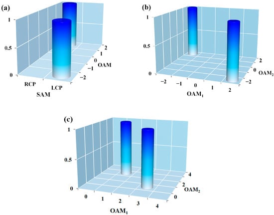 The coincidence histogram for the hybrid SAM-OAM Bell state (a) , and OAM Bell states (b) , (c) .