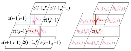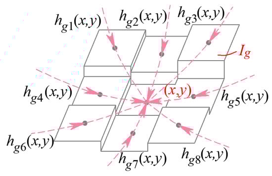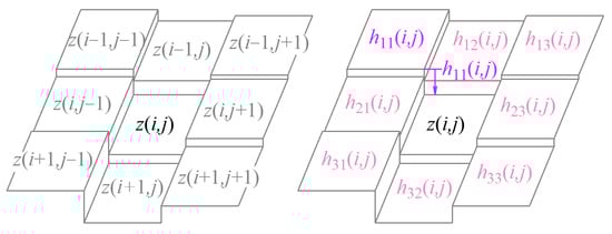 The G0, G1, and G2 continuity parameters are represented below. The G0 continuity parameter concentrates on the eight-directional grayscale gradient in the eight-connected neighborhood of the reference pixel. On the discrete grayscale surface Σ, the grayscale gradients along the eight directions in the neighborhood at pixel (i, j), except the boundary points of the image, can be represented as the grayscale difference between point (i, j) and the adjacent eight pixels, as shown in Figure 2, which are defined as