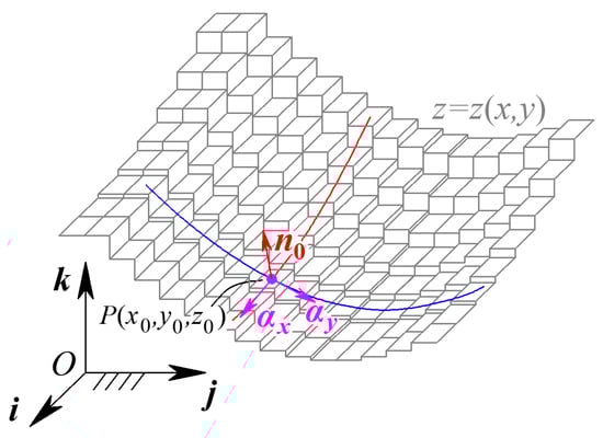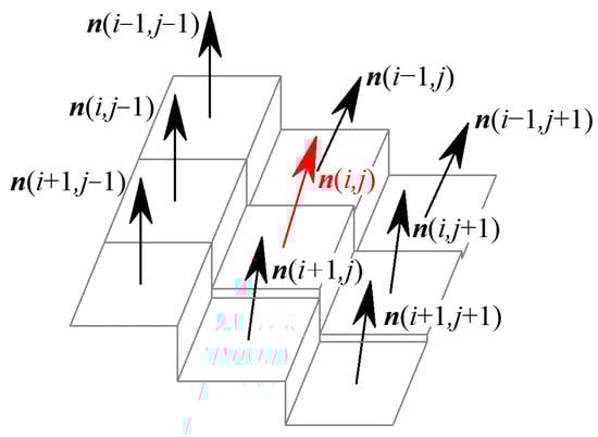 For the reference pixel (i, j) on the equivalent grayscale surface, the grayscale gradients gx and gy can be represented by the G0 order continuity parameters. Substituting Equation (2) into Equation (3), the unit normal vector at pixel (i, j) on the equivalent grayscale surface can be expressed as