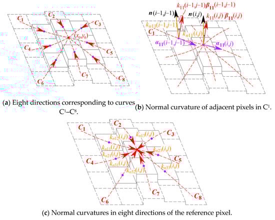 According to the definition of normal curvature above, pixel (i, j) has eight normal curvatures in eight directions, as shown in Figure 5c. The eight normal curvatures corresponding to the directions of C1 to C8, respectively, denoted as kn11 to kn33, are represented as follows: