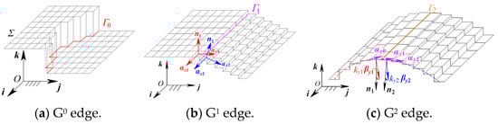 According to the explanation of the k-order geometric continuity condition and corresponding parameters, the k-order geometric continuity edging discriminate criterion can be expressed as follows: the curve Γ is defined as the k-order geometric continuity edge or the Gk (k = 0, 1, 2) edge if and only if one side of the curve Γ on the image satisfies Gk continuity, while the other side only does not satisfy Gk continuity. Reflecting the zero-/first-/second-order geometric continuity of the surface, the three continuity parameters dominate the three types of continuity edges, as shown in Figure 6.