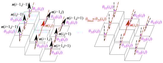 where θ11 to θ33 are the included angles of normal vectors for the pixel (i, j) by pixels in the eight-connected region, which are directly determined by the G1 continuity parameters, as is shown in Figure 8. When at least one of the eight included angles is greater than the specified threshold Snmax, the pixel (i, j) is determined to be the G1 edge point of the grayscale image. The last equation of Equation (10) is the continuity equation for G1 edge points to ensure the continuity of edges and eliminate the isolated edge points. Thus, pixel points satisfy the G1 edge discriminate criterion in Equation (9), except the boundary points of the image are defined as G1 edge points of the grayscale image to compose a G1 edging image.