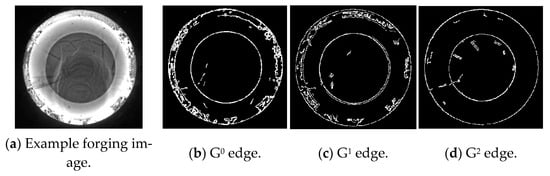 The continuity edges have been provided above based on the continuity parameters, by which an example forging image, as well as the corresponding continuity edgings, are shown in Figure 10. The three types of edging images indicate that the G0 edging reflects the most prominent geometric features and textures on the surface of the forging part, while the grayscale information by the G1 and G2 edges is relatively weak, corresponding to the minor textures on the forging surface and the boundary of the grayscale transition areas outside the forging part. The characteristics between the G0 edging and G1 and G2 edges are discussed below, by which feature edges are defined.