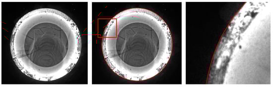 According to the variational principle, the energy functional of the Snakes model can be minimized to achieve the segmentation of grayscale images for hot forgings. However, there exist several limitations in real-time forging image processing for the Snakes. Firstly, manually selected control points around the target part to be segmented are generally required as the starting position of the active contour for Snakes, based on which the energy functional is iteratively solved to achieve target image segmentation. The manual selection of control points can be relatively complex, inefficient, and unstable, making it unsuitable for the real-time segmentation of grayscale images in the online measurement process of forging parts. Secondly, the image force of the Snakes model is entirely determined by the simple calculation of image gradients in two directions, according to Equations (13) and (14). The Snakes image force will work in areas with relatively large local grayscale gradients and obvious grayscale features; however, the image force is relatively weak for cases where the grayscale features are not significantly notable between target and background, which causes quite weak convergence to the target contour for the active contour, as shown in Figure 14 and Figure 15.