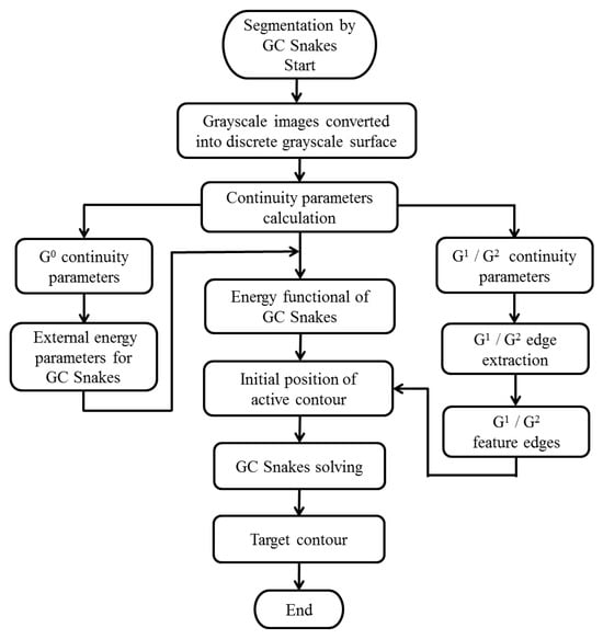 During the solving process, curve v(s) moves continuously by the internal and external forces. When the active contour v(s) is stable, the value on the right side of Equation (23) is taken as 0. At this point, the active contour v(s) is the desired target contour. Therefore, the implementation process for the algorithm of GC Snakes is shown by a flow chart in Figure 17.