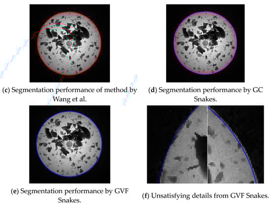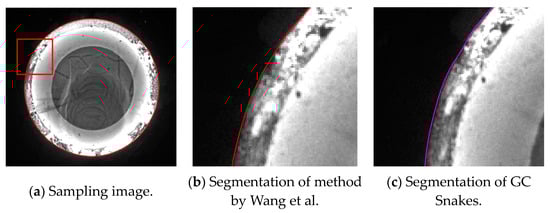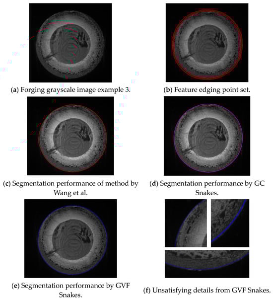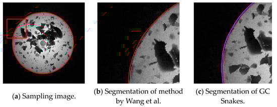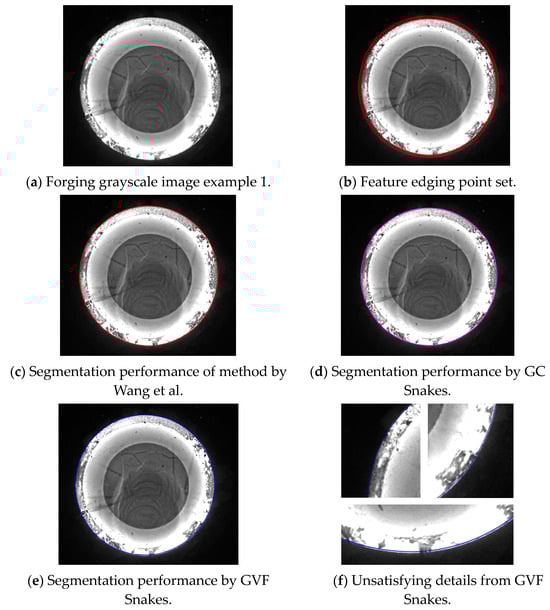 It can be seen that the external energy functional of the Snakes is only defined by two unidirectional gradients, which can hardly reflect the local grayscale properties of the image, so the image force of the Snakes is easily affected by the grayscale of local discrete pixels, that is, greatly prone to being affected by the local grayscale changes near the target area to be segmented; in terms of areas with non-distinct grayscale differentiation from the background, it is more difficult to reflect the changes in grayscale distribution by using two directional gradients. Therefore, the classic Snakes model has poor segmentation performance for forging parts with low grayscale, which has been shown in Figure 15.