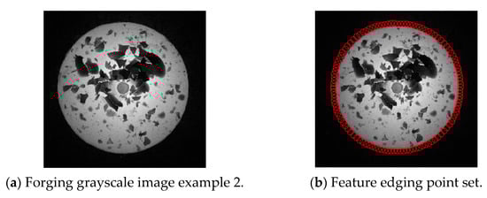 Regarding the limitation of requesting manually selected control points for the Snakes, an effective determination method for the initial control point set is proposed here. As is analyzed in Section 2.3, the area enveloped by the G2 feature edge is slightly larger than the target and thus can fully encompass the target forging part, which is exactly consistent with the properties of the initial control points for the Snakes. Therefore, it has wide applicability in forging image processing to detect the second-order geometric continuity edge and then extract the corresponding feature edge to form initial control points. If CGS represents the initial control points of the GC Snakes and CG represents the G2 feature edge point set, the control points CGS are supposed to satisfy
