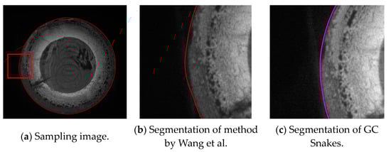 where Eint is the internal energy, which can be represented by referring to Section 3.1. EGCext is the defined geometric continuity external energy that drives the active contour curve to converge toward the target contour.