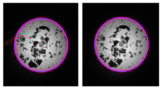 Figure 14 shows the segmentation results of a high-temperature forging image using the Snakes model. Having higher thermal radiation intensity, the area of a high-temperature forging has higher grayscale in the image under the same acquisition conditions. Therefore, the grayscale characteristics of the parts to be segmented are clearly distinguished from the background area, so the Snakes can provide good segmentation results. But for areas with more surface textures formed by oxide scale, the surface temperature is prone to cooling down, which results in lower surface temperature, leading to the lower grayscale in the image at the forging boundary. In this case, the grayscale gradient between the hot forging and the background is non-significant, so the image force is relatively weak, causing poor segmentation performance in the local area. On the other hand, Figure 15 shows the segmentation results of a low-temperature hot forging image using the Snakes model. The lower thermal radiation intensity results in low grayscale, as well as weaker grayscale characteristics in the image. Thus, the image force near the active contour can be relatively weak, generating poor convergence accuracy of the active contour, which makes it hard to meet the measurement accuracy.