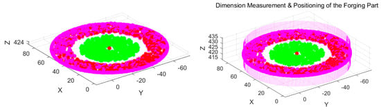 Therefore, the features to be reconstructed consist of two parts during the validation experiments, namely the target contour features F and the upper surface features F0, as shown in Figure 28, where the pink points correspond to the target contour features F while the green points correspond to the upper surface features F0. The extracted forging features F and F0 are matched and then reconstructed in the measurement coordinate system, and the fit envelope cylindrical surface is built up to calculate the geometric parameters required, as shown in Figure 29.