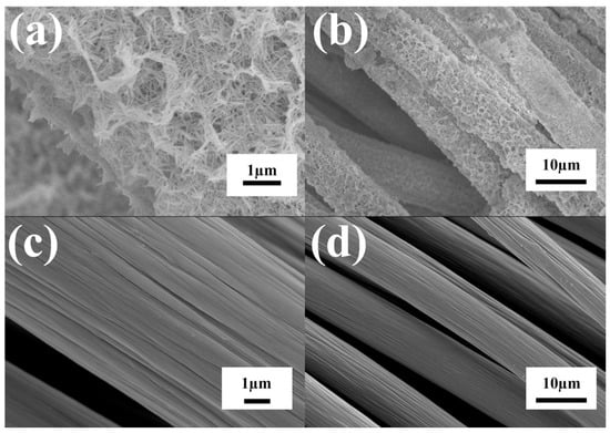 (a,b) High- and low-magnification SEM images of the NC-8@CC electrode. (c,d) High- and low-magnification SEM images of CC.