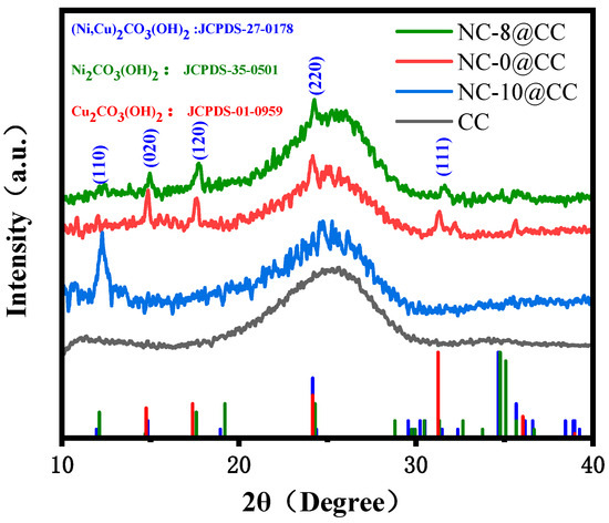 XRD patterns of NC-0@CC, NC-8@CC, NC-10@CC, and CC.