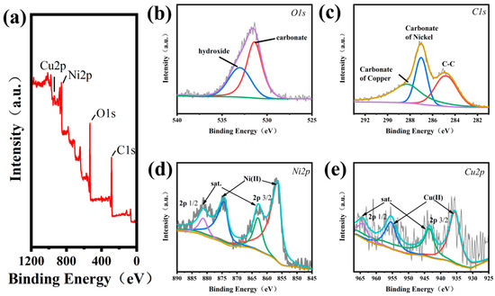 The chemical composition and elemental ratio of the NC-8@CC electrode were studied in detail via XPS analysis, as shown in Figure 3. In Figure 3a, peaks appear near the binding energies of 288 eV, 531 eV, 855 eV, and 935 eV, corresponding to the binding energies of C 1s, O 1s, Ni 2p, and Cu 2p, respectively. Figure 3b shows that the two peaks at 531.40 eV and 533.0 eV for O1s are attributed to metal carbonate and hydroxide [31]. The fine spectrum of C 1s in Figure 3c can be divided into three peaks at 284.8 eV, 287.0 eV, and 288.3 eV, corresponding to the C-C bond of the carbon cloth, CO32− in (Ni(OH)2)0.75(H2O)0.16(NiCO3)0.09 [41], and CO32− in malachite [42]. These results indicate the successful synthesis of nickel–copper carbonate hydroxide materials on the carbon cloth surface. In Figure 3d, the peaks at 935.3 eV and 955.1 eV, as well as the satellite peaks at 943.4 eV and 964.2 eV, belong to the 2p3/2 and 2p1/3 of Cu(II). These binding energies are higher than that of copper carbonate hydroxide (934.6 eV) [42], indicating that Cu(II) enters the nickel malachite lattice and is influenced by lattice effects. Similarly, in Figure 3e, Ni shows peaks at 856.3 eV and 874.1 eV, corresponding to 2p3/2 and 2p1/3, and satellite peaks at 863.0 eV and 881.2 eV. These binding energies are also higher than those of nickel carbonate hydroxide (855.8 eV) [43], reflecting the good combination of Ni and Cu.