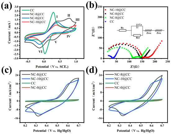 To further understand the electrochemical properties of the prepared electrodes, the electrochemical active surface area was estimated using cyclic voltammetry (CV) in a 0.1 M KCl solution containing 5 mM K3[Fe(CN)6], as shown in Figure 4. Figure 4a exhibits six current peaks in the solution, with peaks I and VI corresponding to the redox process of K3[Fe(CN)6]. This pair of peaks is observable on all electrodes, with the NC-8@CC electrode showing the highest peak current, according to the formula