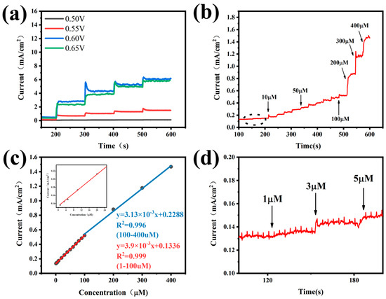 In using chronoamperometry, the linear detection of ammonia nitrogen by the NC-8@CC electrode was investigated. To determine the optimal detection potential, responses to continuously added NH4Cl were tested at 0.50 V, 0.55 V, 0.60 V, and 0.65 V, as shown in Figure 6a. At 0.50 V, there was no response to the continuous addition of NH4Cl, indicating that the reaction had not initiated. A weak step response was observed at 0.55 V. At both 0.60 V and 0.65 V, a strong step response was observed, although the current at 0.65 V was slightly lower compared to that at 0.60 V. In considering energy consumption and interference resistance, 0.60 V was chosen as the detection potential for ammonia nitrogen.