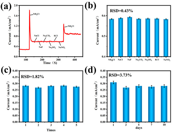 Figure 7c shows the i-t response of the NC-8@CC electrode to 50 μM NH4Cl across five repetitions, with an RSD of 1.82%. Figure 7d indicates that the current response of the NC-8@CC electrode changed minimally over 10 days, with an RSD of only 3.73%, reflecting good stability. This stability may be attributed to the introduction of carbonate ions in the NC-8 material, which enhances local negative charge, repels various anions, and improves overall material stability.