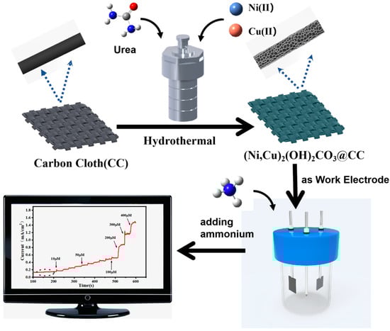 In this study, nickel–copper carbonate hydroxides were synthesized on the surface of a carbon cloth current collector via a hydrothermal method, exhibiting high electrochemical activity and relatively fast electron transfer, facilitating the reaction, as schematically illustrated in Scheme 1. The insertion of carbonate enhanced its anti-interference properties against various anions and improved its stability. The prepared electrode was tested for ammonia nitrogen sensitivity using a simple and rapid i-t method, showing a wide detection range, high sensitivity, good reproducibility, stability, and excellent anti-interference properties against various anions and cations.