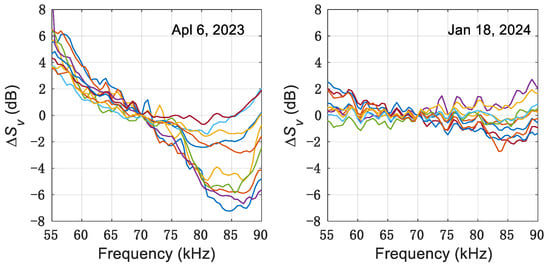 A total of 260 and 350 SV spectra were obtained on 6 April 2023, and 18 January 2024, respectively. Due to variations in organism density, the amplitudes of SV spectra differed. For ease of representation, Figure 1 shows the relative frequency response (∆SV spectra) of some typical SV spectra of A. chinensis and R. hispidum. , where is the ∆SV spectra [26]. The results indicate different shapes of the SV spectra. The SV values for R. hispidum exhibited a decline with rising frequency, in contrast to A. chinensis, whose SV values showed little variation. This disparity highlighted a clear distinction in the spectral profiles of SV for the two organisms.
