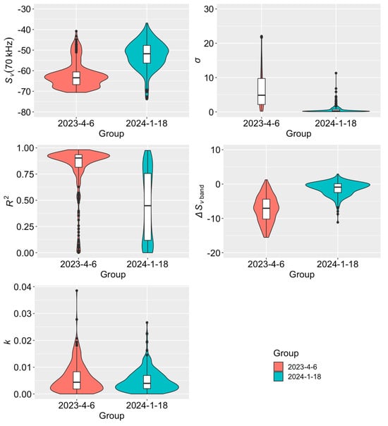 Violin plots of , , , , and k from the SV spectra of R. hispidum and A. chinensis observed on 6 April 2023 and 18 January 2024.