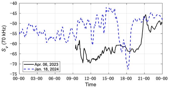 On 6 April 2023, the catch from the set net totaled 760 kg, comprising 10 kg of small fish and 750 kg of jellyfish. Among them, the small fish mainly consisted of Ambassis gymnocephalus with body lengths of less than 6 cm, while the jellyfish were predominantly large jellyfish R. hispidum with umbrella diameters of less than 80 cm. No A. chinensis was observed in the catch. Approximately 98.7% of the catch’s weight consisted of R. hispidum, indicating that the echoes recorded on 6 April 2023, were predominantly from this species. The catch from the set net on 18 January 2024, totaled 370 kg, comprising 24 kg of small fish (mainly A. gymnocephalus with body lengths of less than 6 cm), 346 kg of A. chinensis, and a few small jellyfish with umbrella diameters of less than 2 cm. A. chinensis accounts for approximately 81.4% of the catch; therefore, the echoes on 6 April 2023, are primarily attributed to A. chinensis.