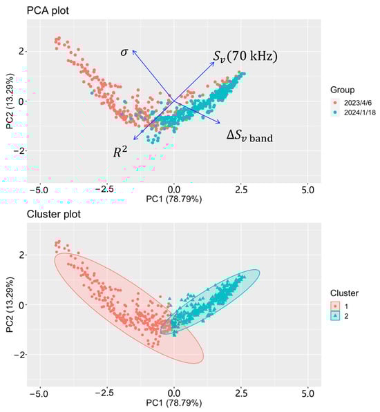 In this study, five characteristic variables were extracted from the SV spectra to quantify the differences between the SV spectra of R. hispidum and A. chinensis. These variables not only contained information regarding the scattering strength of biological echoes but also data concerning the shape of the SV spectra. The of R. hispidum was concentrated between −70 and −57 dB (see Figure 2). The range from −57 dB to −40 dB was thought to be attributed to a small number of strong echoes from the school of fish. The of A. chinensis was concentrated between −65 and −40 dB (see Figure 2). This is because the density of A. chinensis was much higher than that of R. hispidum. From the four variables, in Figure 2, excluding k, it could be found that the SV spectra of the two zooplankton exhibited different spectral characteristics. Therefore, the Principal Component Analysis (PCA) algorithm was further employed to process the SV spectrum characteristic parameters of R. hispidum and A. chinensis obtained on 6 April 2023, and 18 January 2024. Subsequently, cluster analysis was performed on these SV spectra using the k-means algorithm, and the results are shown in Figure 4. The k-means clustering algorithm achieved an 83.4% accuracy rate in correctly classifying R. hispidum and A. chinensis, demonstrating a strong classification effect. Misclassified samples might be attributed to echoes from other organisms, such as A. gymnocephalus. In previous studies, characteristic parameters such as the shape of fish school echo and geographical environment information have also been used for acoustic species classification [28,29,30]. In the future, these parameters could be potentially included to enhance the accuracy of R. hispidum and A. chinensis classification.