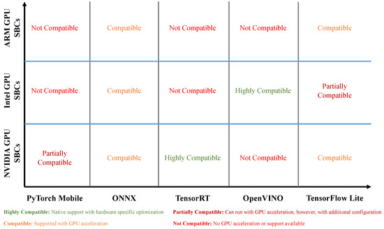 Graphical Processing Units (GPUs) have played a significant role in advancing the field of CV, particularly in deep learning-based approaches [17,18]. GPUs are highly parallel processors designed for rendering graphics, but their architecture and computational power have made them indispensable for accelerating a wide range of compute-intensive tasks, including CV algorithms. The parallel nature of GPUs allows for the efficient execution of matrix operations and Convolutional Neural Networks (CNNs), which are fundamental to many CV tasks [18]. In recent years, GPUs have seen remarkable advancements in both hardware and software, enabling their seamless integration into edge-computing environments and Single-Board Computers (SBCs) [19,20]. Hardware improvements include enhanced GPU architectures with increased parallelism, higher memory capacity, and improved power efficiency, making them compatible with the resource-constrained SBCs commonly used in various edge-computing applications. These advancements have enabled GPUs to handle more complex and sophisticated CV algorithms in real time to address real-world problems, making them a preferred choice for edge devices with limited resources. On the software front, various frameworks and libraries have emerged to harness the power of GPUs for accelerating CV tasks. NVIDIA’s Compute Unified Device Architecture (CUDA) framework has become a widely adopted solution, providing a programming model and runtime system for GPU-accelerated computing [21].
