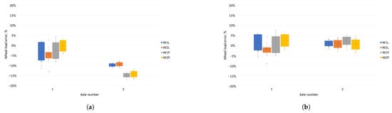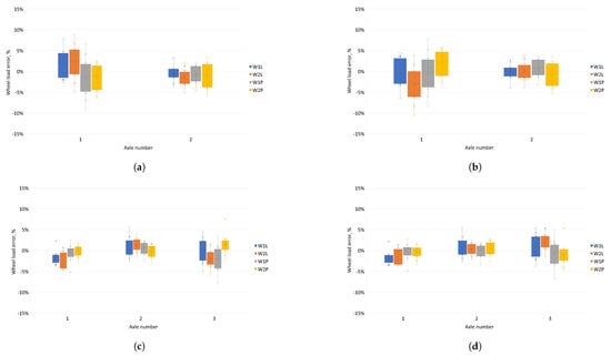 The classification of the accuracy of the vehicle weighing system was established by considering the inaccuracies in calculating the total mass of the vehicle at the measurement station and the inaccuracies in calculating the axle load of the vehicle [9]. The pressure of each vehicle axle was determined as the sum of the average wheel pressure values of each axle measured on the two lines of sensors. Inaccuracies in the axle load calculation compared to the reference value for each method were used to determine the pressures applied to the sensors. These inaccuracies for each test vehicle are depicted in Figure 13.