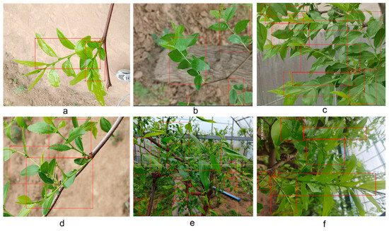 Figure 1 presents partial images of jujube leaf branches, along with their labeled versions. The data were collected under various weather conditions, during the stage of jujube leaf bud development. Comparing Figure 1a,b,e, there are certain morphological differences in the jujube leaf branches. Comparing Figure 1c,f, the shooting angles differ, leading to varied representations of their form.