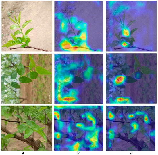 It can extract the implicit information of jujube leaf branch features. Figure 6 shows the heat maps before and after the modification of the detection head. Figure 6a is the original image, Figure 6b is the heat map generated by the original algorithm, and Figure 6c is the heat map after replacing the detection head. It can be observed that the improved heat map shows better effectiveness in extracting the features of the jujube leaf branch. Before the improvement, the features around the jujube leaf branch were also extracted, which had a significant impact on the accuracy of the identification. The improved heat map shows that the features are more concentrated, which can effectively identify jujube leaf branches.