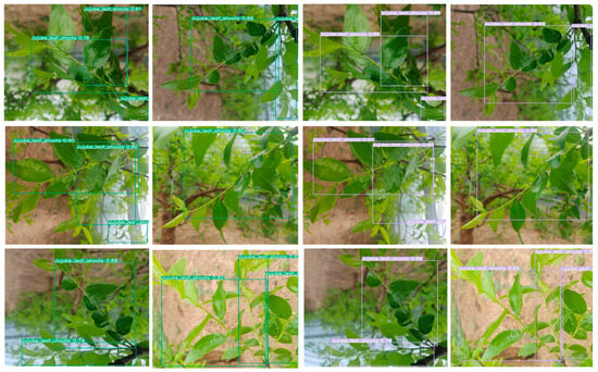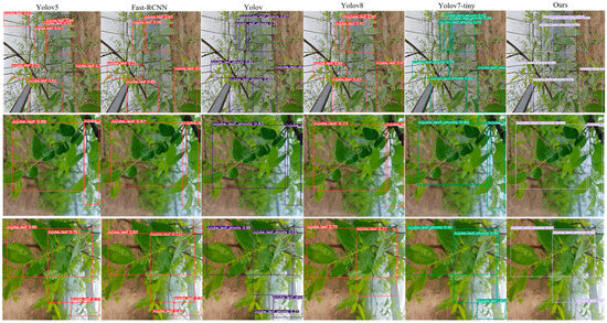 Considering the dataset of jujube leaves, the overlapping of the leaves is a limiting factor in their detection. In comparison, the improved network, by incorporating attention mechanisms and replacing the detection head, enhanced the recognition of jujube branch features. Other YOLO series models, such as YOLOv5 and YOLOv8, also support this finding. The YOLOv8 and YOLOv7-tiny algorithms have fewer floating-point operations, but their recognition rates are 3% lower than our model, and all the other metrics are also lower than our model. Due to the overlapping of jujube leaves, the overall recognition rate of the jujube leaf identification models is relatively low.