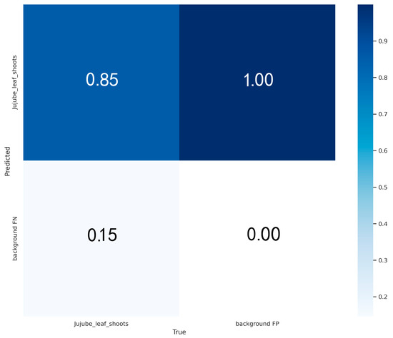 Figure 9 presents the confusion matrix of our algorithm’s object detection performance. The matrix reveals that our model misclassified the target jujube leaf shoots as background at a rate of 15%. Upon comparison with the labeled images in Figure 1 and the heatmap in Figure 6, it is evident that the data-labeling process has inadvertently incorporated background noise characteristics. These noise features, which are distinct from the target jujube leaf shoots, have been extracted by the algorithm and incorrectly labeled as the target class.