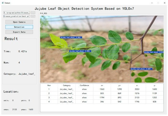 Based on the proposed method, we developed a supervisory application for jujube leaf detection. It can complete the detection and location of jujube leaf branches. This software can acquire data from the camera, enabling real-time detection and localization of jujube leaves.