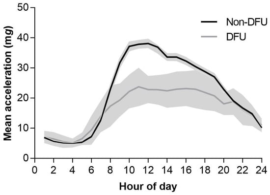 Mean hour-by-hour acceleration (95%CI) across the day by DFU status, adjusted for age, sex, and ethnicity.