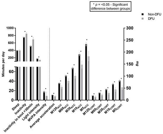 The intensity of accumulated (MXACC) and continuous (MXCONT) activity for both those with DFUs and non-DFUs reported are lower when compared to values previously reported for desk-based office workers, particularly for the DFU group [29]. Non-DFU MXCONT and MXACC values were similar to those reported in individuals previously admitted to hospitals for COVID−19; however, DFU values were again lower [30]. The most striking difference between the two groups’ physical activity was in the continuous activity (MXCONT) metrics. The % difference between DFU and non-DFU in these metrics was greater compared to the total time accumulated (MXACC) metrics. This highlights the importance of including an assessment of how physical activity is accumulated as well as how much activity is accumulated. Metrics that reflect the intensity of continuous physical activity or intervals of activity are easily derivable from accelerometers and allow for a greater understanding of physical activity profiles and how conditions, such as DFUs, impact physical activity.