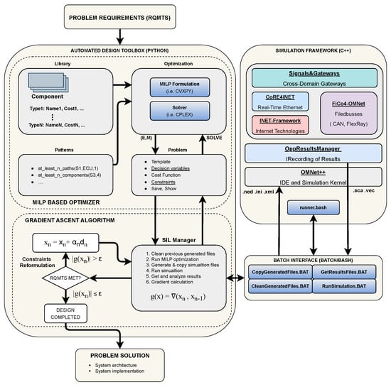 After each optimization step, all required simulation configuration files are automatically generated by the SIL Manager. In particular, the initialization files (.ini), the network description files that define the hardware parameters and the network topology (.ned), and the CAN-to-Ethernet gateway configuration file (.xml), which contains both the specification of the CAN messages to be routed over the Ethernet domain and the aggregation strategy, are automatically written from the topology selected by the optimizer. After generating the configuration files, the SIL Manager launches the simulation. The results are then automatically extracted through the opp_scavetool method, provided by the OMNet++ engine, which converts files from the native .vec and .sca formats into .csv. At this point, the results are analyzed, verifying the latency for each data stream, the bandwidth occupation, calculating the jitter and verifying the bus load of the CAN line. To manage the interface between the optimizer and simulation environment, batch Application Programming Interfaces (APIs) are developed. This choice allows independence of the software from the simulator, to make it extensible if other simulation environments are used in the future. Specifically, simulations are run within a MinGW command line, with a bash script that runs the simulation in OMNet++ without a Graphical User Interface (GUI) to save resource usage. We implement automatic communication between the software and the “runner.bash” that manages the simulation by writing and clearing flags that signal the beginning or end of the simulation. To implement both the gateway between the CAN network and the Ethernet domain and the CAN network simulation setup, we use the Pyhton “cantools” library, which parses the CAN database (.dbc) containing all the CAN message features (ID, Transmission rate, etc.). Starting from a list of necessary signals to be forwarded to the ECU that implements the control logic, we automatically generate an .xml file describing the implementation of the gateway, which is necessary to simulate the message forwarded from the CAN domain to the Ethernet domain. In addition, the SIL Manager computes the bus load to compare it with the simulation results and to verify that it meets the system requirements. After verifying the results, if they do not meet the requirements leading to an unfeasible solution (e.g., if the schedulers of the control units are not able to allocate the slots for communication), the constraints are reformulated and re-inserted as input to the optimizer in an iterative manner until a satisfactory solution is obtained. For the reformulation of the constraints, we use a search strategy based on the gradient ascent method to avoid a brute-force approach that is unfeasible due to the high simulation times.