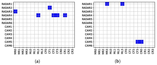 Optimized mapping matrices between virtual and real components representing the commercial devices selected as sensors. (a) bandwidth maximization, (b) energy minimization.