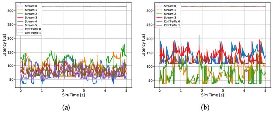 Optimized E/E architecture stream latencies of the different simulated streams (AVB and TTEthernet) of sensor/command data. (a) bandwidth maximization, (b) energy minimization.