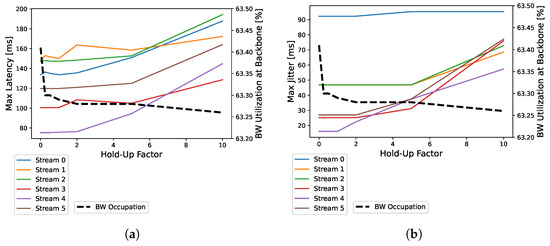 Latency and jitter analysis for different hold-up factor values. (a) maximum latency vs. hold-up factors, (b) maximum jitter vs hold-up factors.