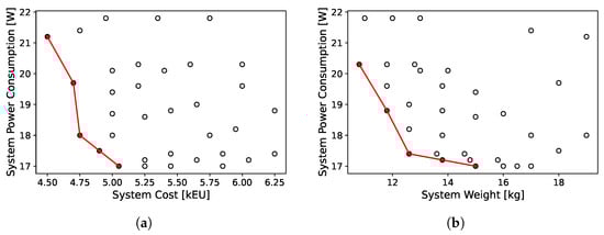 Pareto fronts in the case study for optimizing system power consumption (the red line is the Pareto front). (a) system power consumption vs system cost, (b) system power consumption vs system weight.