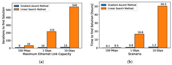Scalability analysis for different maximum link capacity scenarios between gradient ascent and linear search methods. (a) maximum link capacity vs total iterations, (b) maximum link capacity vs total resolution time.