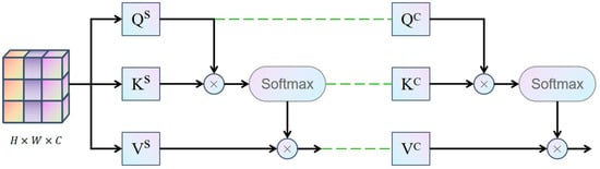 Additionally, after computing spatial attention, OSA transposes the feature matrix to perform channel attention calculations, further enhancing the model’s ability to capture global information. Similar to spatial self-attention, channel attention also computes the dot product, but it is performed along the channel dimension: