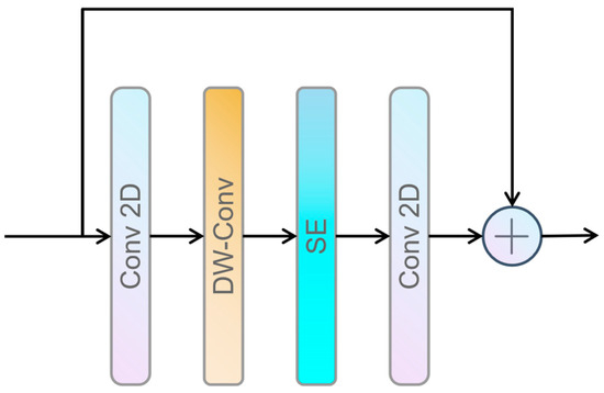 In this figure, Conv 2D represents a 2D convolutional layer, DW-Conv stands for the depthwise separable convolutional layer, and SE denotes the squeeze-and-excitation module.