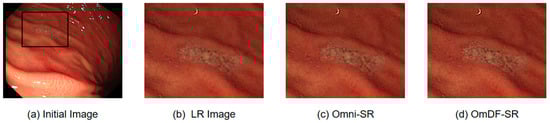 As the number of training epochs increases, the loss value of the model shows a clear downward trend, indicating that the algorithm is gradually learning the key features in the data and effectively optimizing the errors in the super-resolution reconstruction process. The improved algorithm demonstrates a faster loss reduction rate compared to the original algorithm. This suggests that enhancements such as the improved feature aggregation mechanism and optimized attention distribution effectively accelerate the model’s learning process, improving the accuracy and efficiency of super-resolution reconstruction. As shown in Figure 7, by introducing the DAFM and DEAF, OmDF-SR exhibits higher sensitivity and accuracy in handling complex textures and fine edges in endoscopic images. Figure 7a displays an original endoscopic dataset image. For a more intuitive comparison, Figure 7b enlarges a key area from Figure 7a,c, which shows the results using the Omni-SR algorithm, and Figure 7d shows the results using the OmDF-SR algorithm. By comparing these images, the advantages of the improved algorithm in detail processing and texture enhancement are evident. Particularly in the edge and highly textured regions, the OmDF-SR algorithm shows clearer boundaries and less noise, not only enhancing the visual effect of these areas but also improving the overall texture of the image, making clinical diagnosis more convenient and accurate.