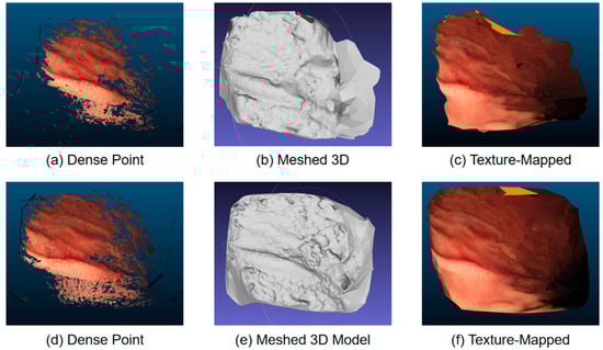 The reconstructed models are shown in Figure 8, where Figure 8a–c represent models without image super-resolution preprocessing, and Figure 8d–f represent models with preprocessing. According to qualitative evaluation, the 3D models with preprocessing exhibit superior point cloud density, meshing quality, and texture mapping richness compared to those without preprocessing. The dense point cloud model with preprocessing (Figure 8d) demonstrates higher point cloud density and lower noise levels, which are crucial for subsequent meshing and texture mapping. The meshed 3D model (Figure 8e) and the textured model (Figure 8f) both show finer structural details and higher visual realism, providing a more accurate foundation for further clinical applications and academic research.