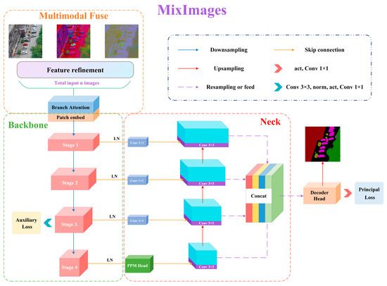 As shown in Figure 1, the proposed MixImages follows the standard encoder–decoder structure, and it is coupled with a multimodal fuse, backbone, and neck modules, ultimately outputting segmented probability distribution results.