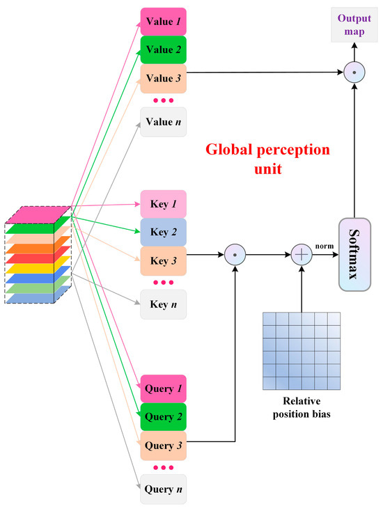 where and represent the results after the self-attention operation and the output of the local perception unit, respectively; represents k × k (k = 1 here) convolution; represents k × k (k = 3) depthwise separable convolution (depthwise convolution + pointwise convolution). With the aforementioned operations, we can efficiently model local relationships.