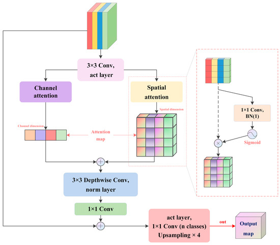 The overall structure of the proposed feature decoder head is shown in Figure 3. To suppress invalid information before output, we use channel attention and spatial attention to localize the region of interest, respectively. Specifically, in the spatial path, we generate the projection feature map of x ∈ ℝB×1×H×W by pixel-by-pixel convolution and then adjust its data distribution through the Sigmoid function to generate a spatial attention map with a value range of [0, 1] based on the original feature map. We use the element-wise sum to fuse the attention features of the two paths, then smooth through a 3 × 3 depthwise convolution, and finally perform pointwise convolution for information interaction in the channel dimension, restoring the number of channels. To prevent network degradation, we use residual connections. The process before accessing the classifier can be approximated as