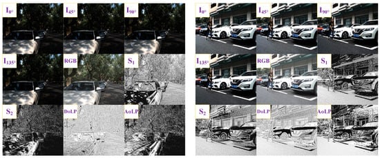 ZJU-RGB-P (http://www.wangkaiwei.org/dataseteg.html (accessed on 3 December 2023)) is a challenging public dataset of urban scenes, which contains eight foreground classes: building, glass, car, road, tree, sky, pedestrian, and bicycle. Highly reflective objects, such as glass and cars, have RGB information that is easily confused with the environment. In polarized images, highly reflective objects have a specific polarization angle that can be used for better segmentation. The dataset contains data from four polarization angles (triple-band): I0°, I45°, I90°, and I135°. Based on the four polarization angle data and the Stokes vector, the polarization secondary products S0, S1, and S2 can be obtained. Among them, S0 describes light without any polarization and is also regarded as RGB imagery. The Stokes vector calculation formula is as follows: